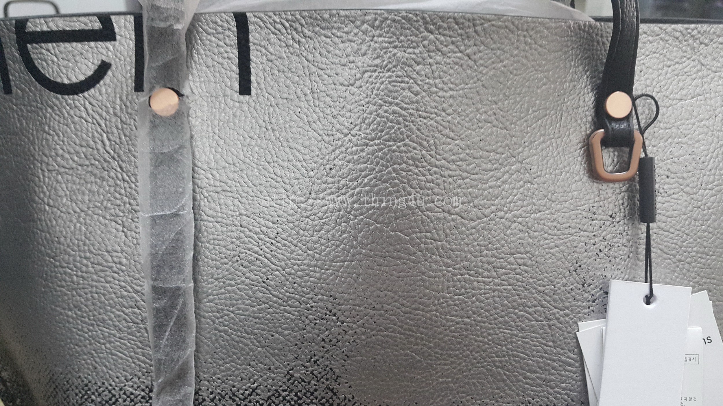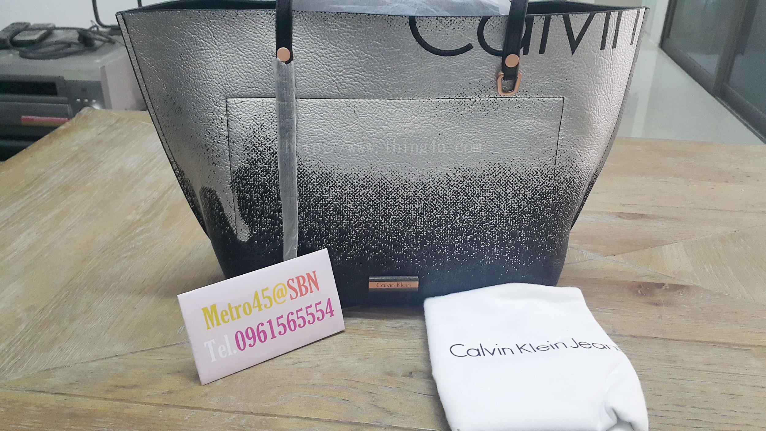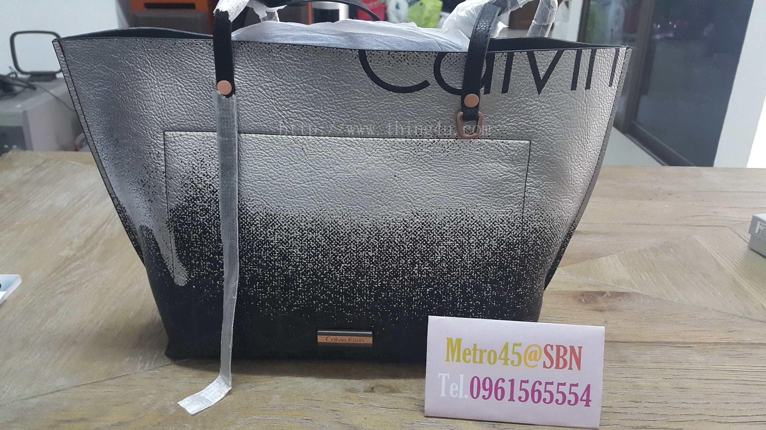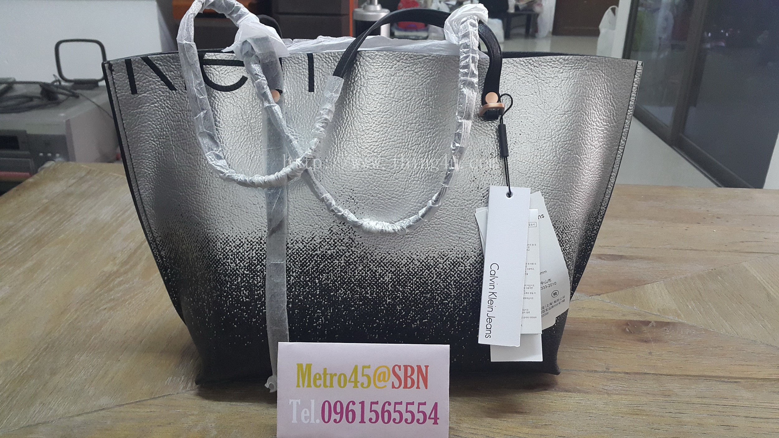 กระเป๋าสะพายข้างผู้หญิง ยี่ห้อ Calvin Klein (ของใหม่) ทรงพัดหนังสีดำ พ่นสีเงินที่ด้านบนของใบเพิ่มความโดดเด่นมาก ใบนี้สะพายแล้วดูดีมาก ๆ ตัวสายเป็นหนังออกแบบให้ยาวข้างสั้นข้าง ข้างที่สั้นจะตกเเต่งด้วยห่วงเหล็กสีเชมเปญ ทั้งหน้าหลังของใบ ภายในเป็นหนัง มีที่ใส่ของ 1 ช่องใหญ่ 1 ช่องซิป และ 1ช่องเล็ก อะไหล่ทุกชิ้นเป็นสีเชมเปญ ขนาด ด้านบน 42 ซม. ด้านล่าง 30 ซม. สูง 27 ซม. มีถุงผ้าให้ (สินค้ารับประกันเป็นของแท้แน่นอน 100 %)